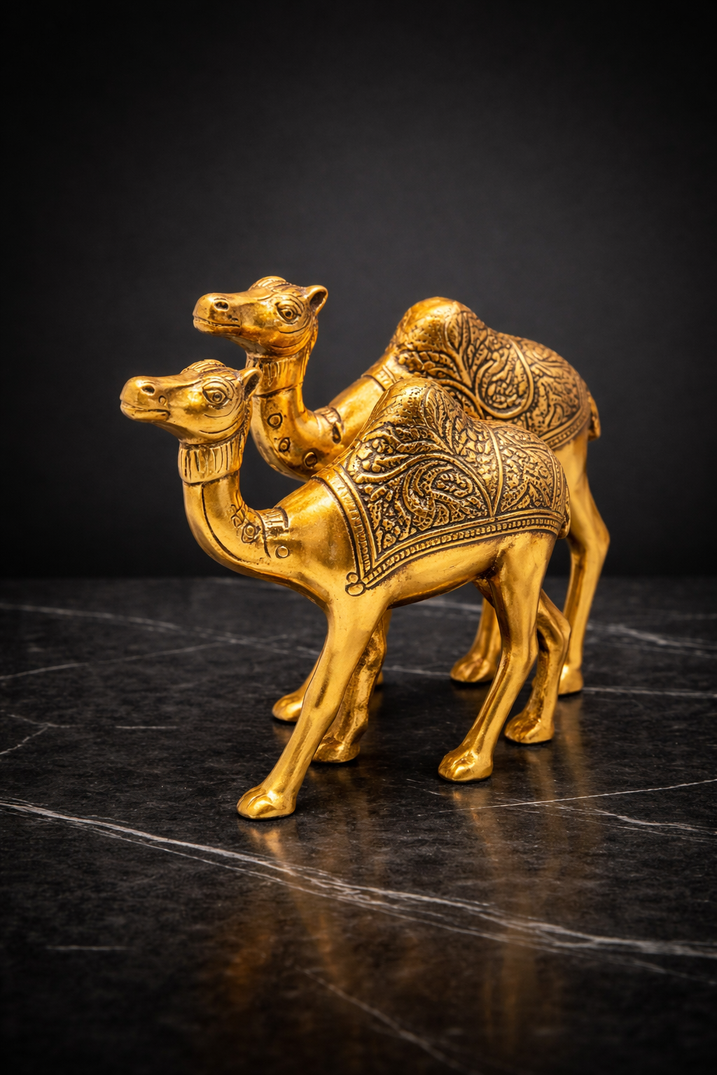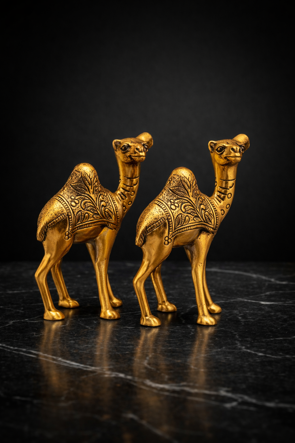 This pair of golden camel figurines beautifully captures traditional charm with a touch of elegance. Crafted with intricate hand-etched patterns, each camel showcases detailed floral and geometric designs that reflect classic artisanal craftsmanship.
